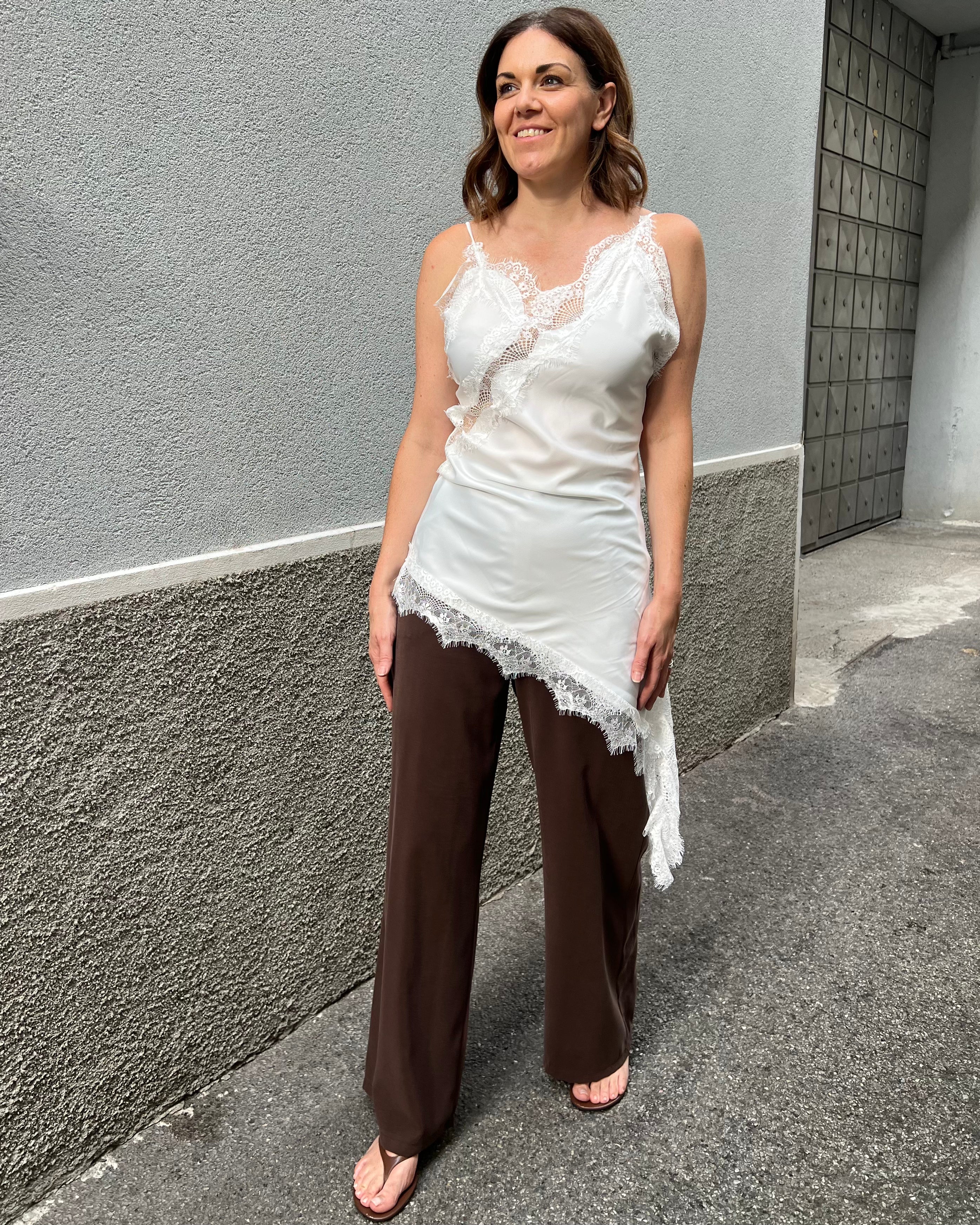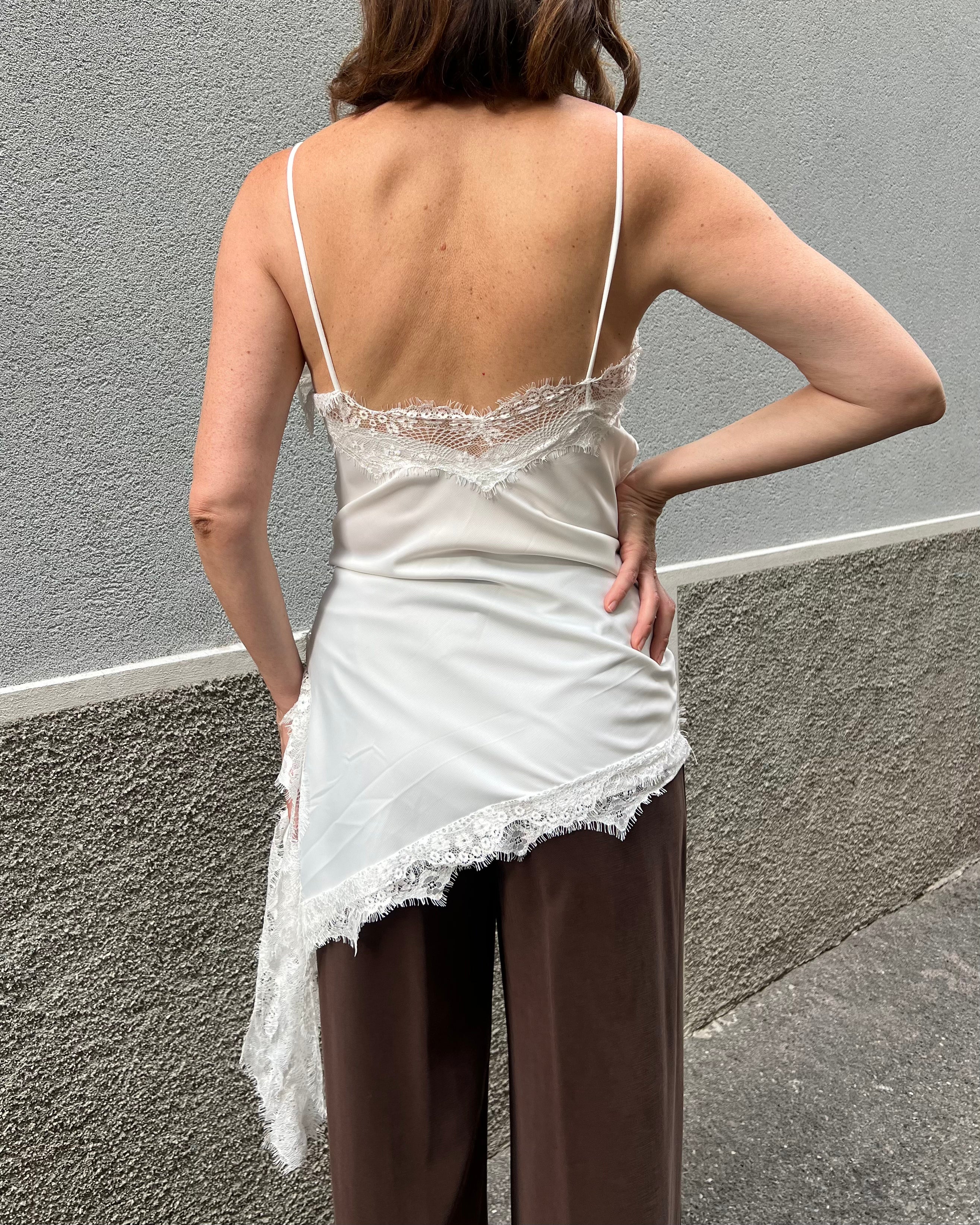 Mini abito satinato con scollo a V e spalline sottili elastiche. Dettaglio di applicazione in pizzo. Fondo asimmetrico con spacco.