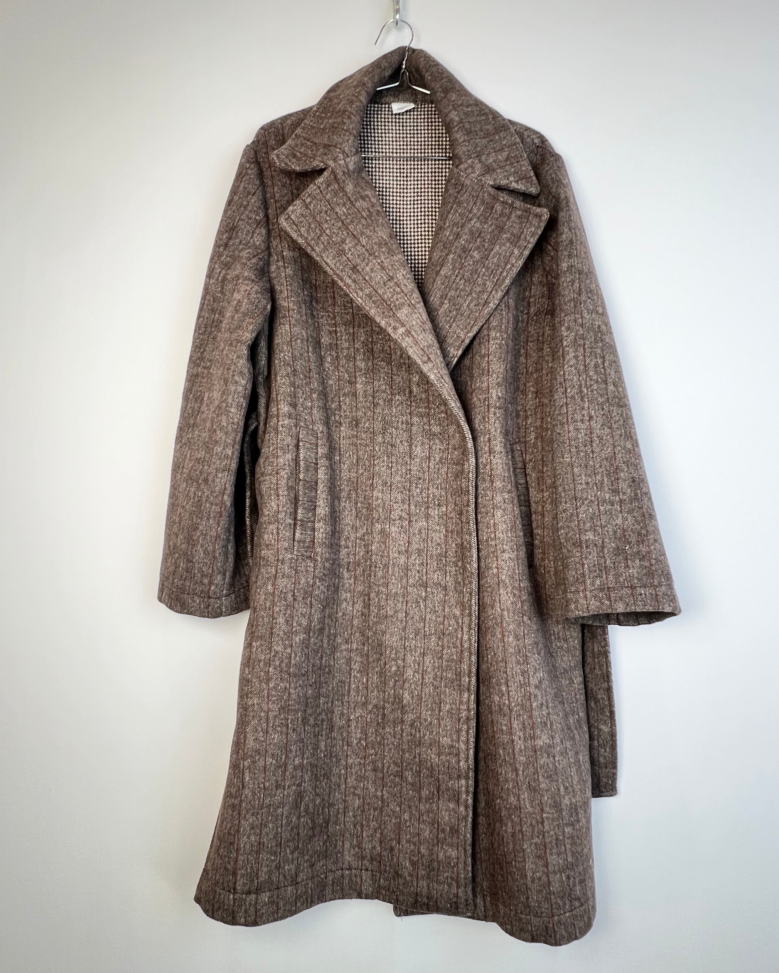 Cappotto dalla linea dritta con spacchi laterali. Tessuto spigato con gessatura color bruciato e stampa pied de poule all'interno. Collo a rever, maniche lunghe e tasche a filettone. Allacciatura a vestaglia tramite cintura coordinata.