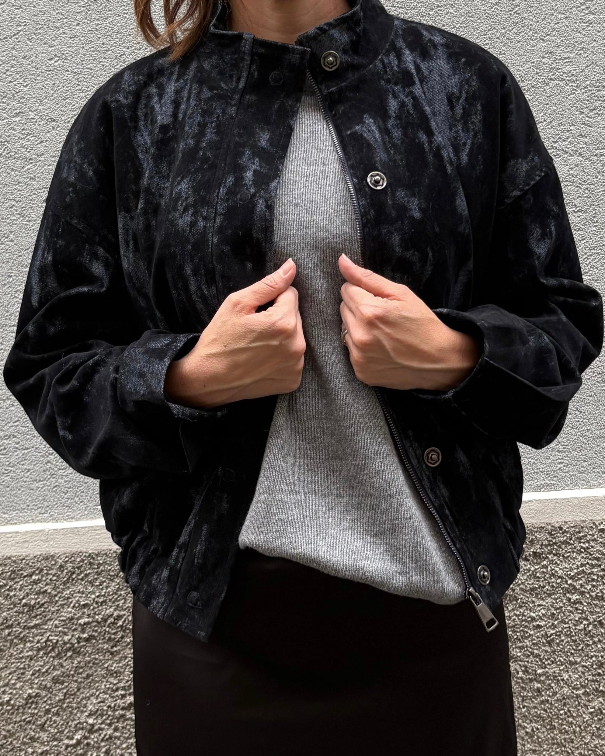 Giacca bomber in tessuto denim e velluto floccato, tasche laterali e fondo elasticizzato. Ha una chiusura frontale con zip e bottoni automatici.