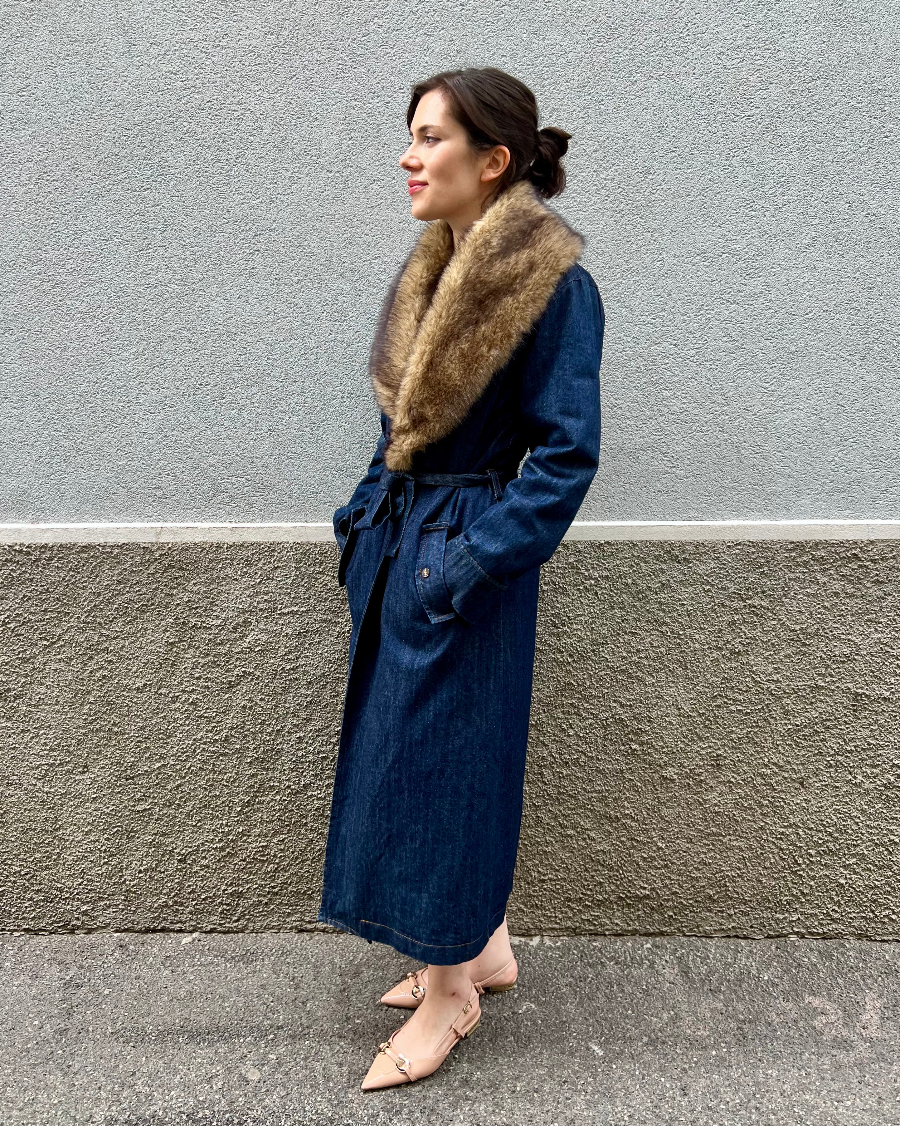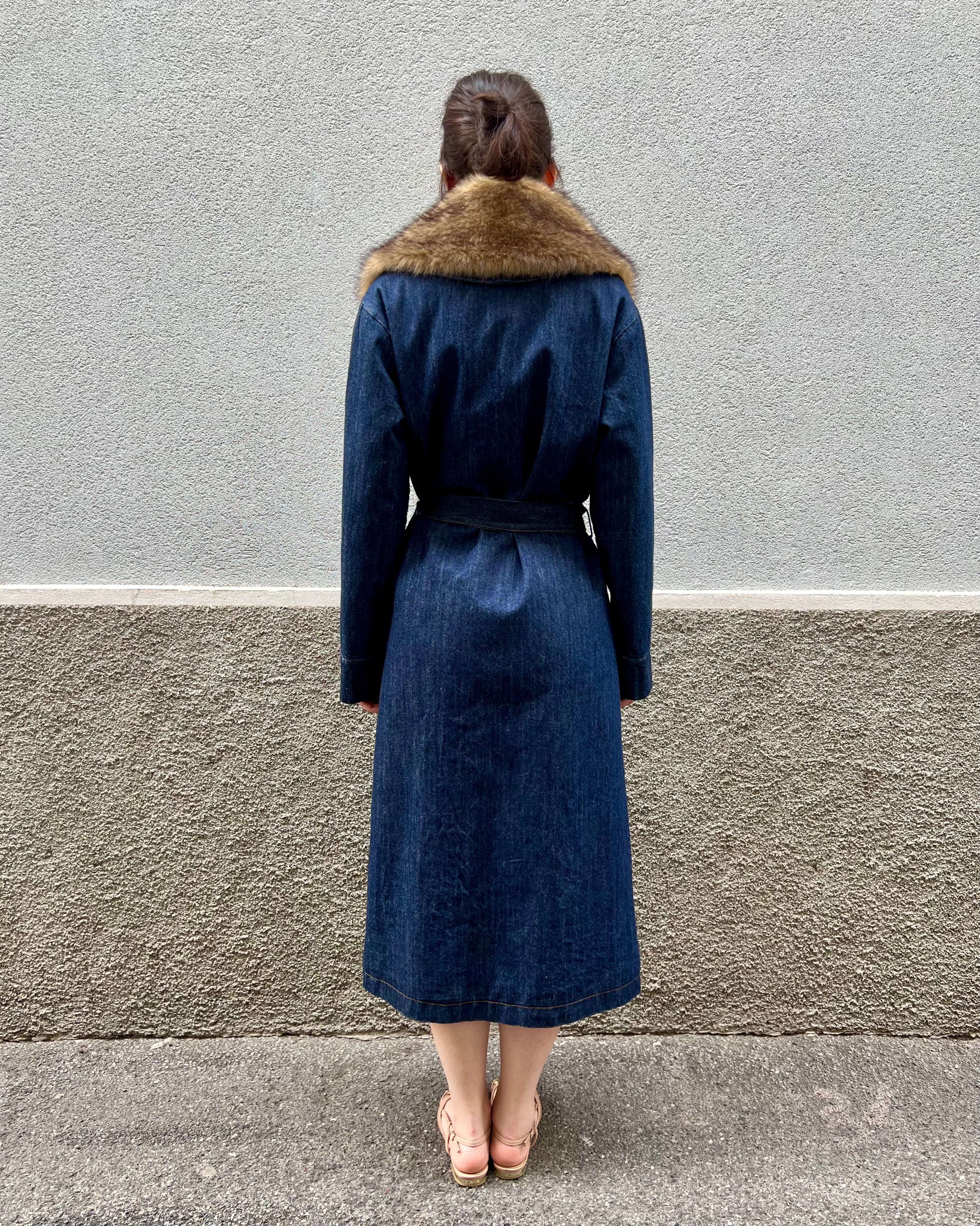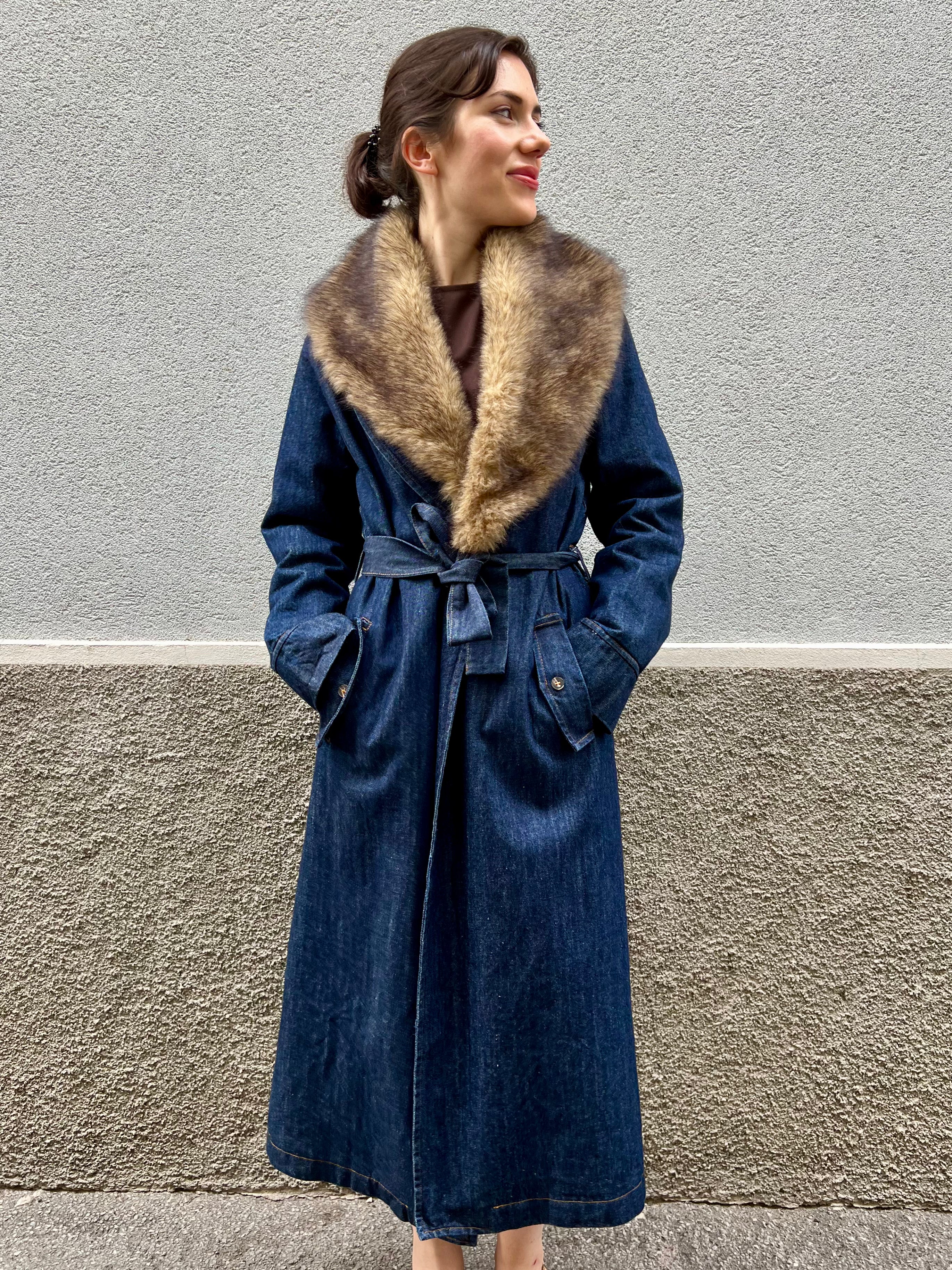Trench lungo in resistente denim con interno trapuntato. Tasche frontali e cinturina in vita. Ampio revers con collo in eco-pelliccia rimovibile per look versatili.