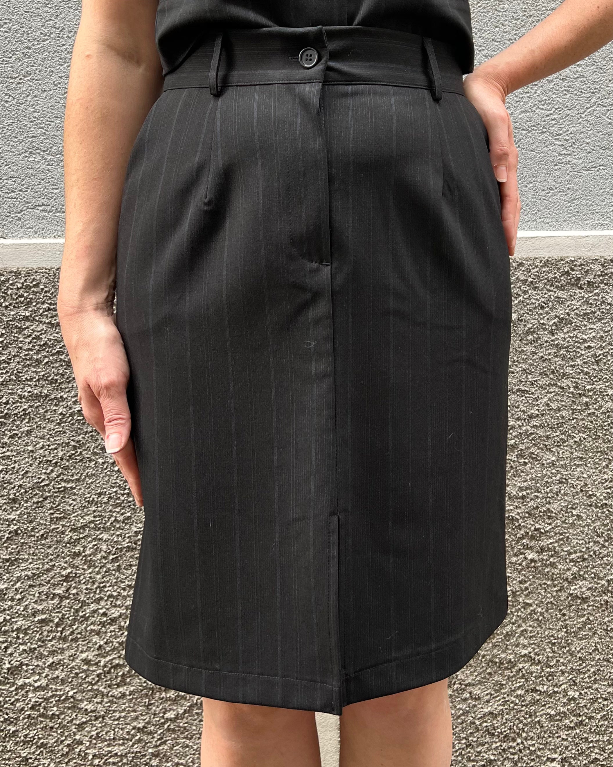 Longuette gessata realizzata in tessuto strutturato ma confortevole, spacco frontale e chiusura con zip e bottone.