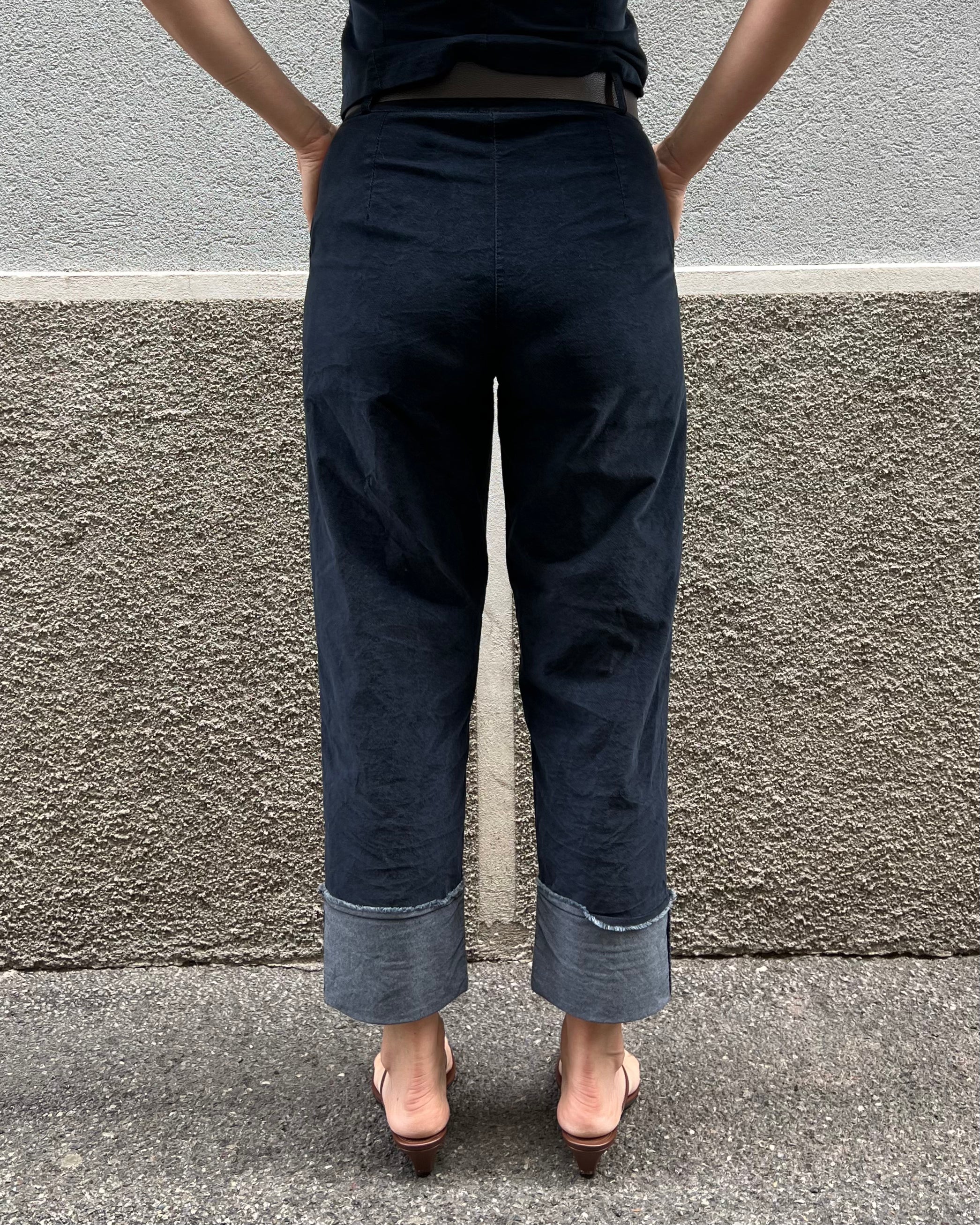 Pantaloni in velluto elasticizzato dalla gamba asciutta con maxi risvolto sul fondo. Chiusura frontale con cerniera e bottone, cintura compresa.