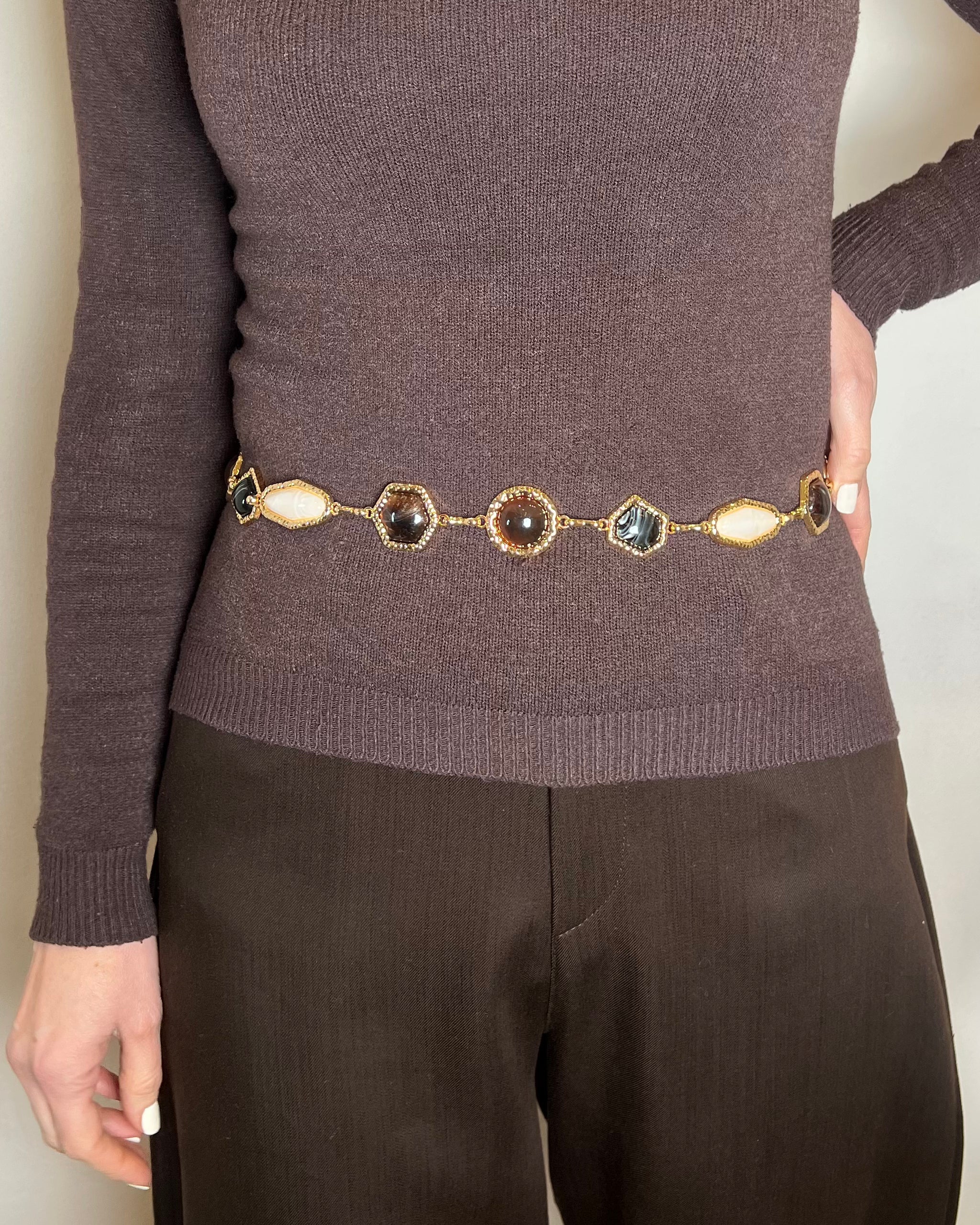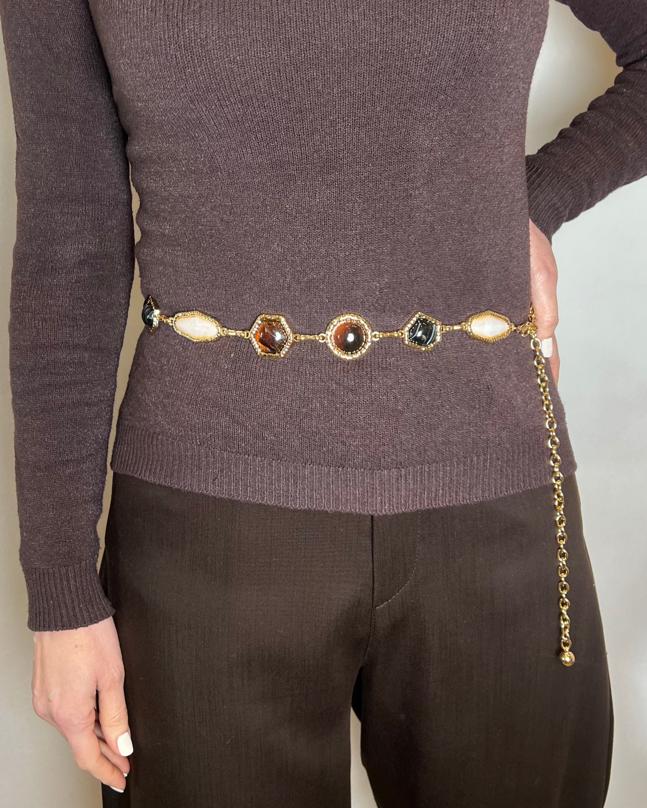 Cintura a catenella in metallo dorato con pietre decorative con profili in oro lavorato e chiusura regolabile con moschettone