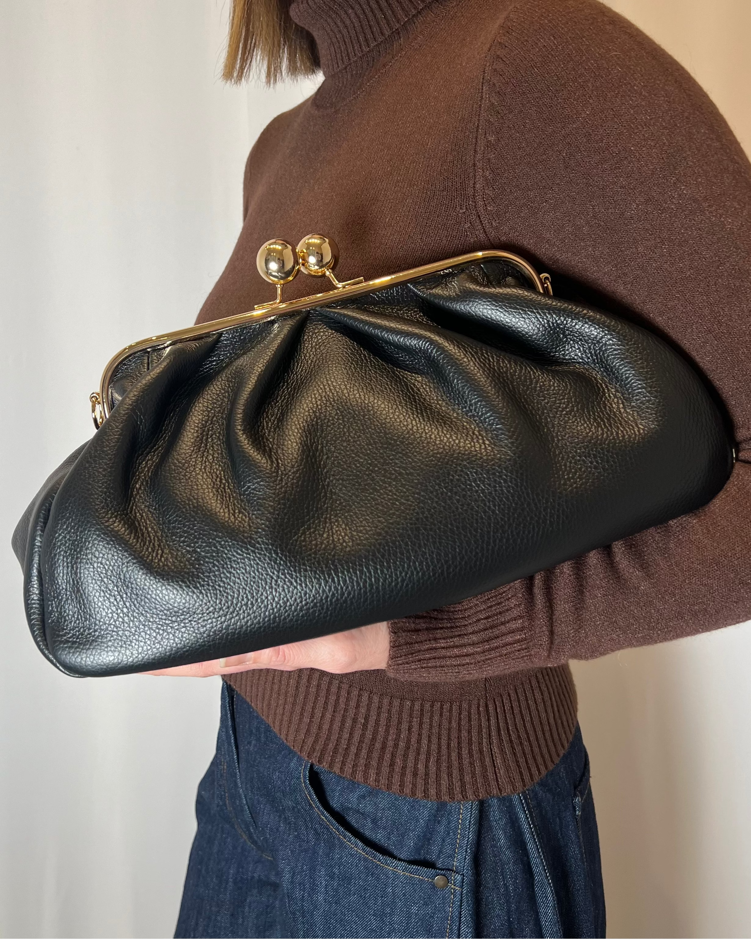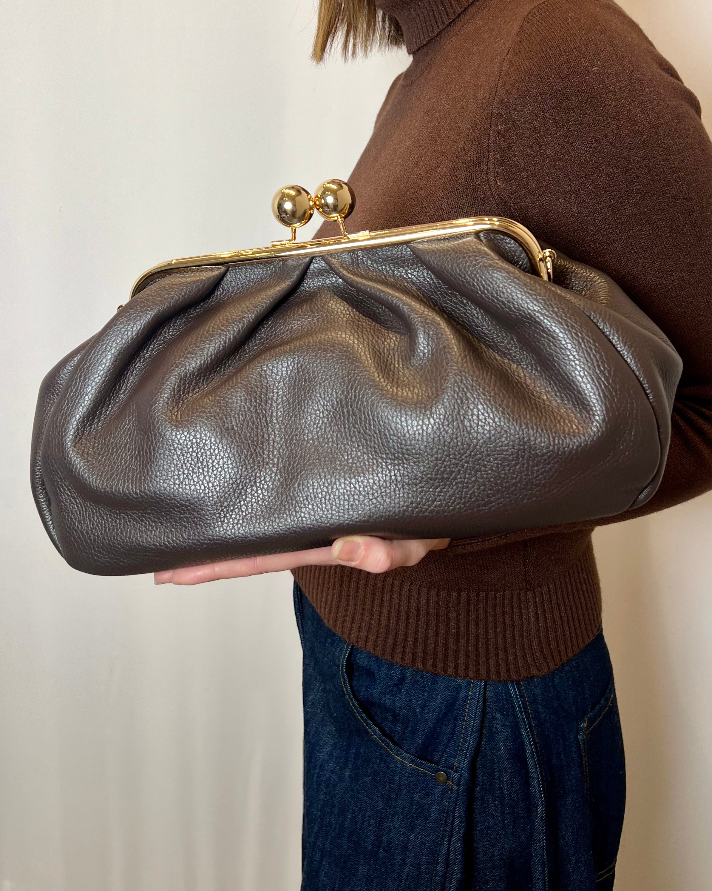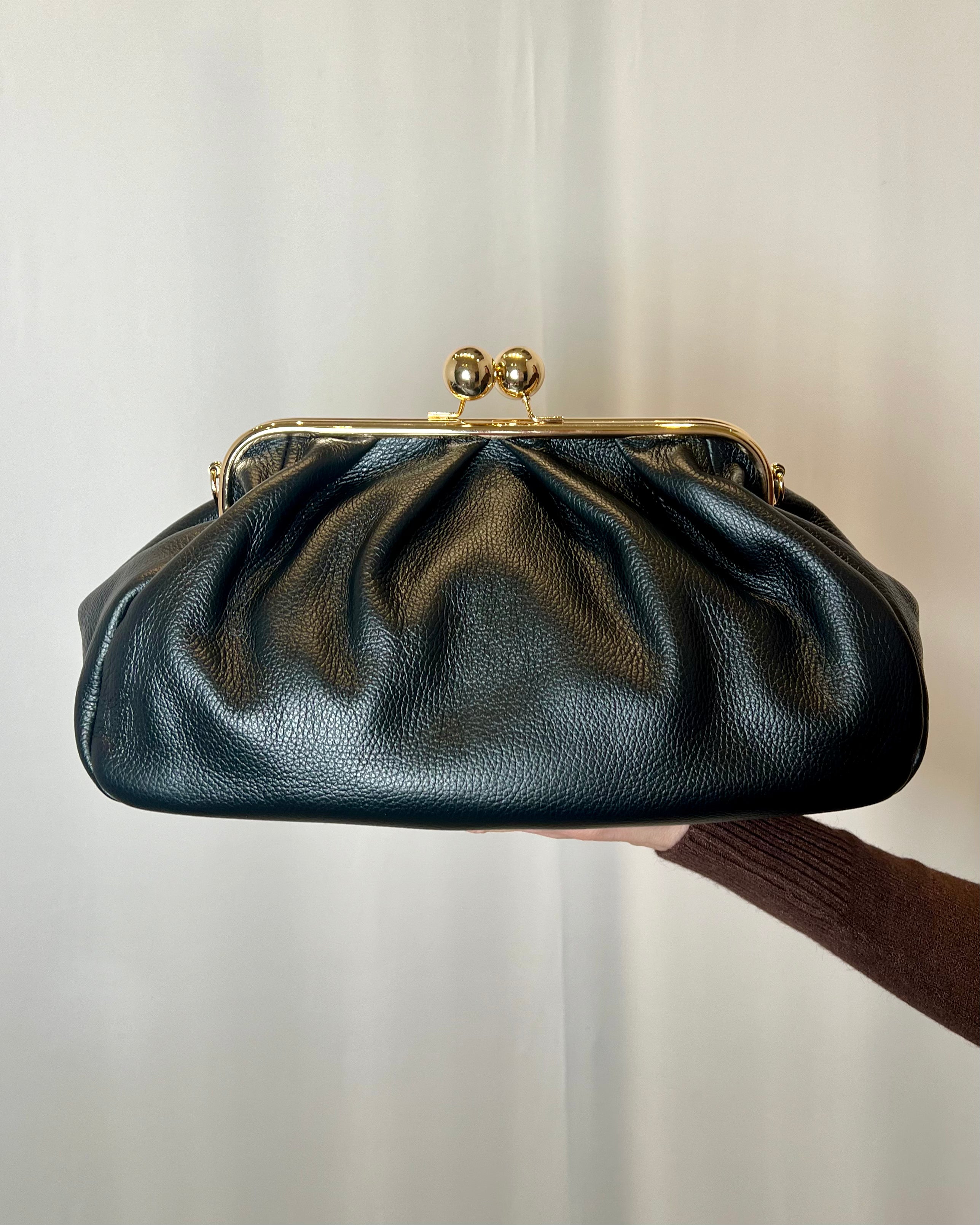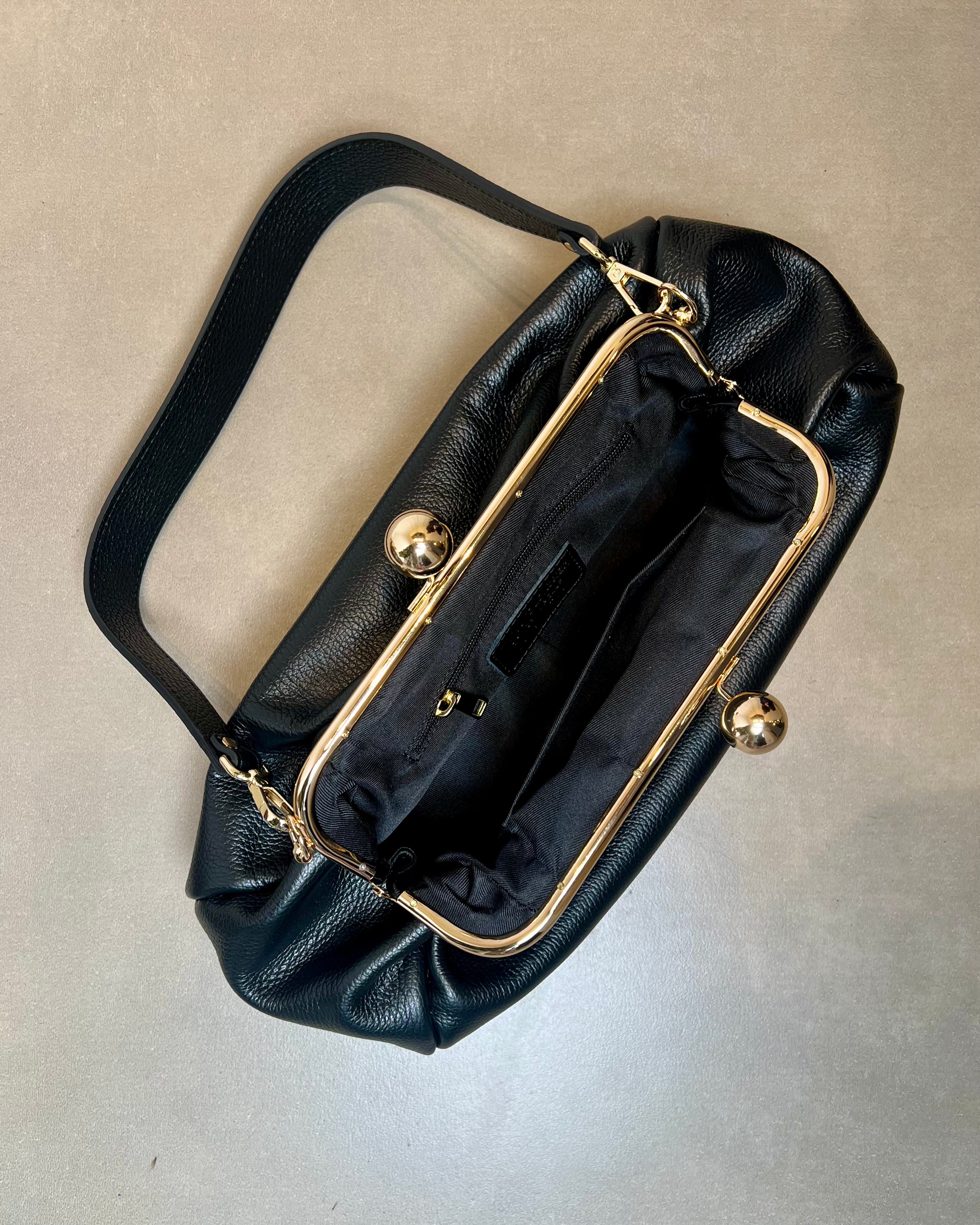 Clutch in pelle martellata con chiusura clutch con boules dorate. Doppia tracolla rimovibile in pelle che permette di portarla sia a mano che a tracolla. Interno capiente.