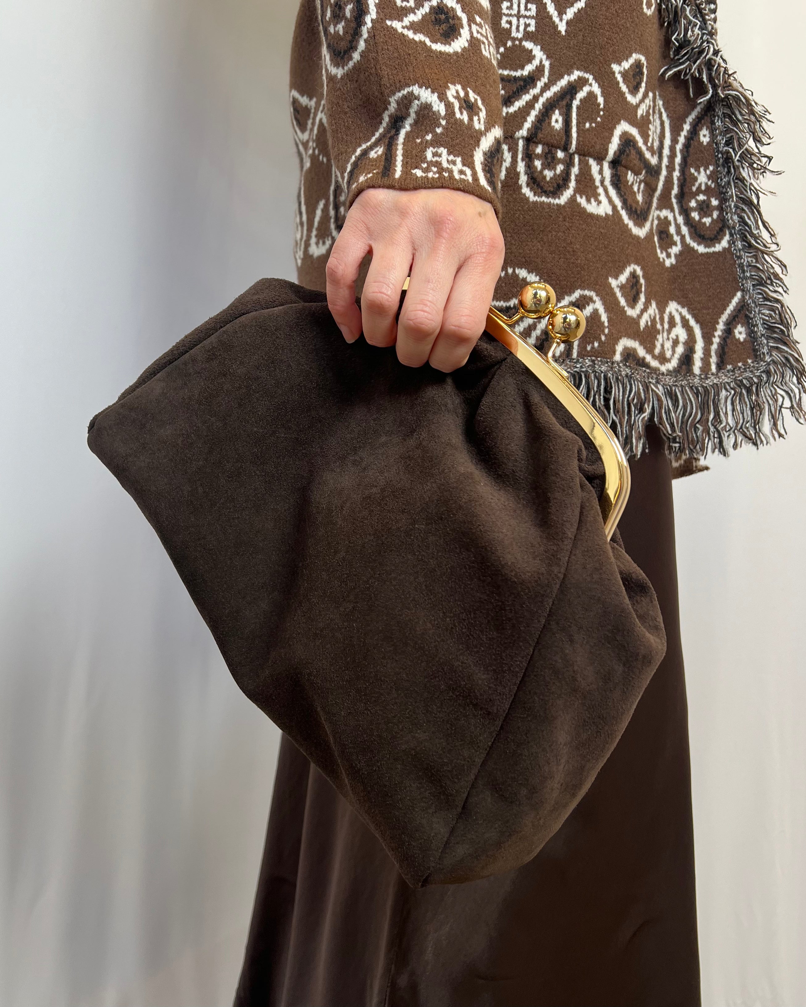 Clutch in suede con chiusura clutch con boules dorate. Tracolla rimovibile in catena dorata che permette di portarla sia a mano che a tracolla.