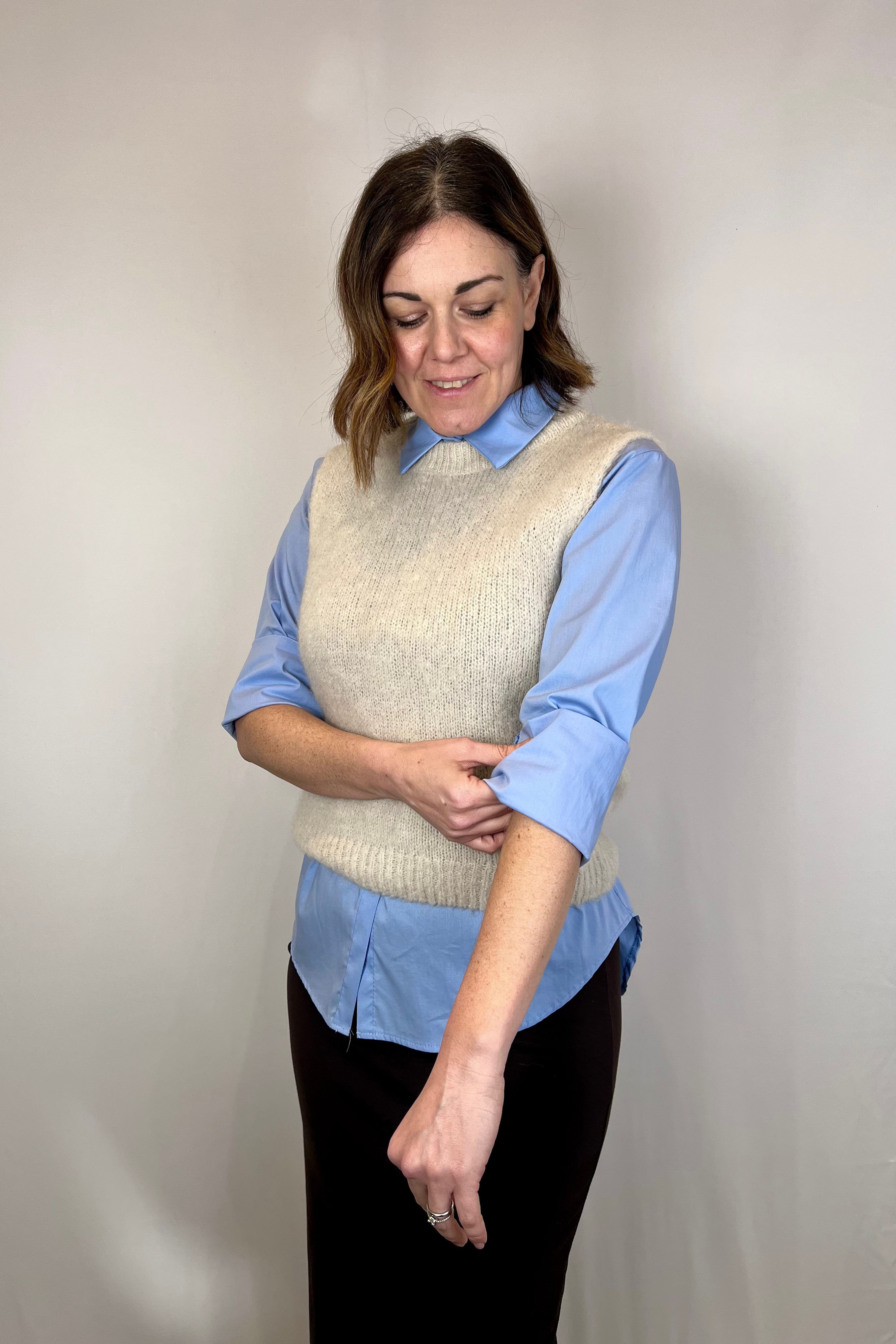Gilet girocollo.Composizione: 42% poliamide 30% kid mohair 25% alpaca 3% elastan.