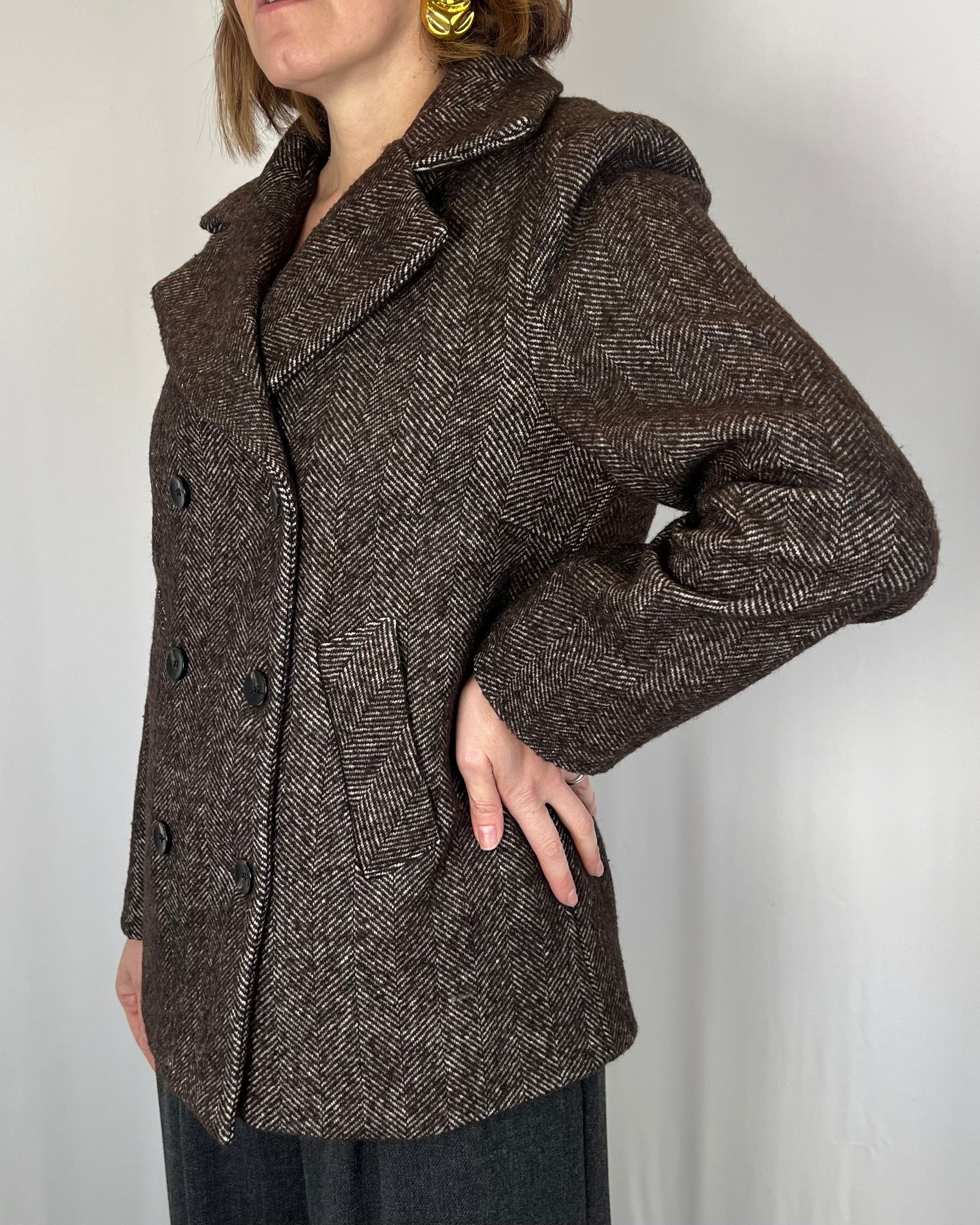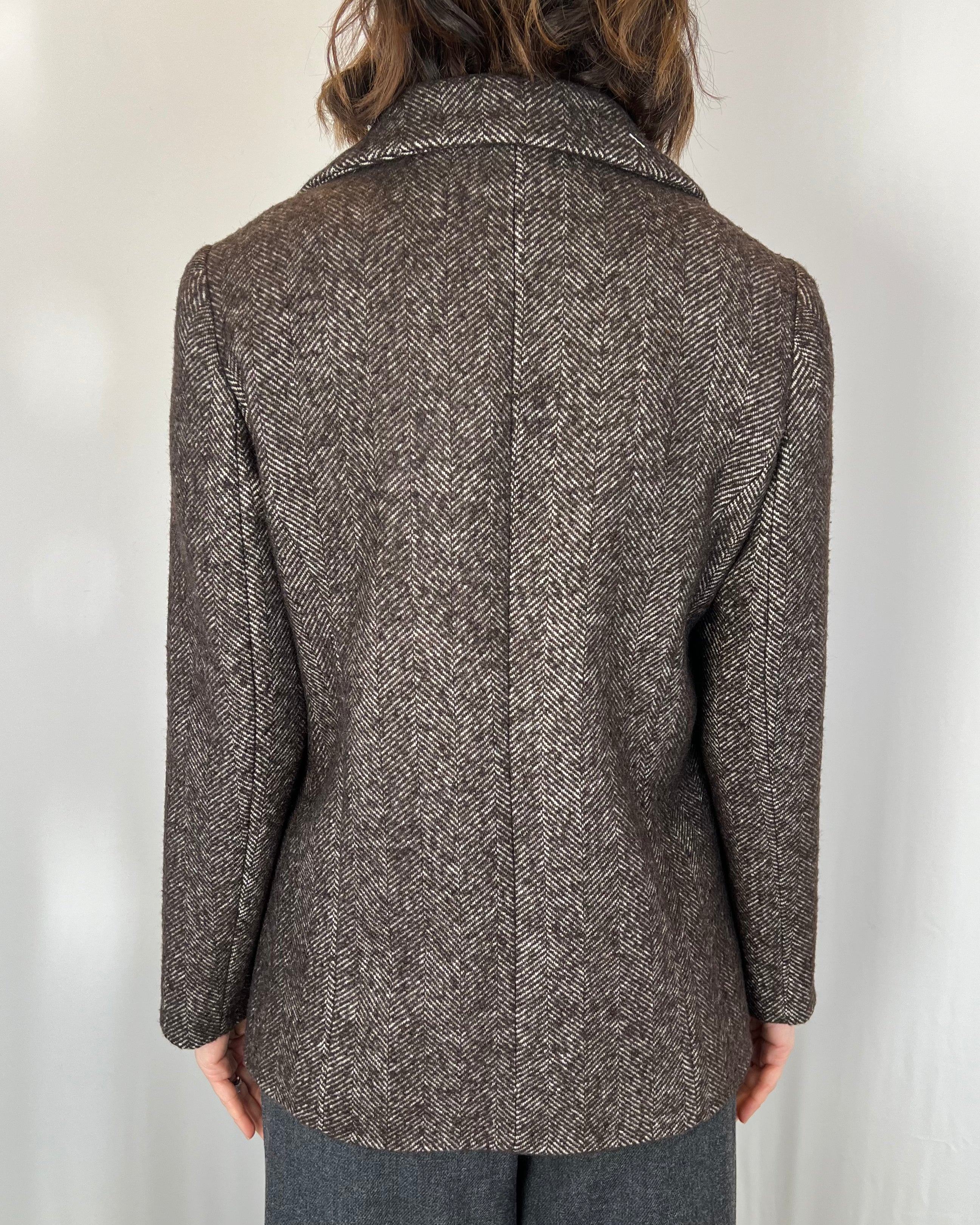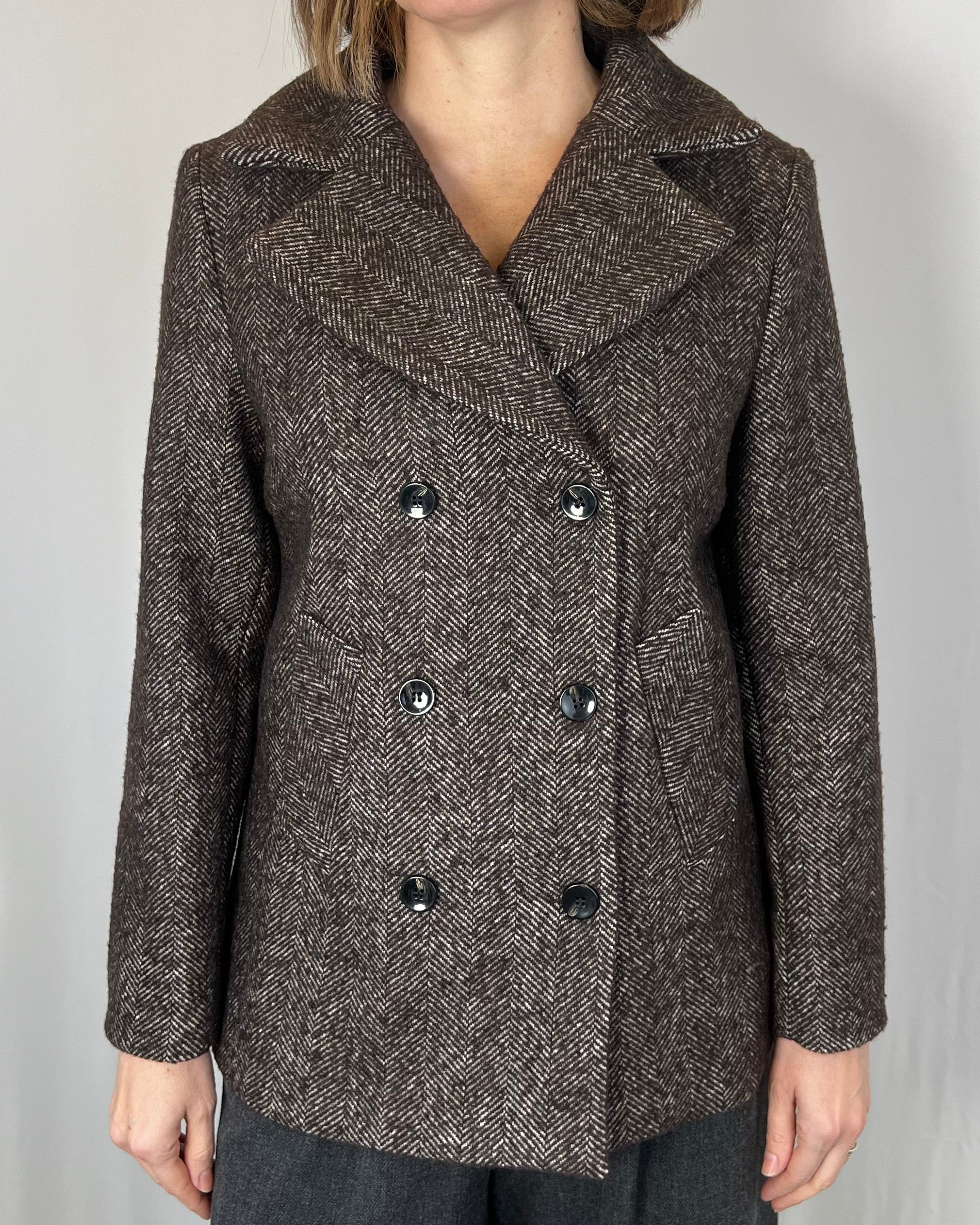 Composizione esterna: 70% poliestere, 20% lana, 4% viscosa, 4%poliammide, 2% altre fibre.Fodera: 100% poliestere.La modella è alta 1,73 m e indossa la taglia 42.