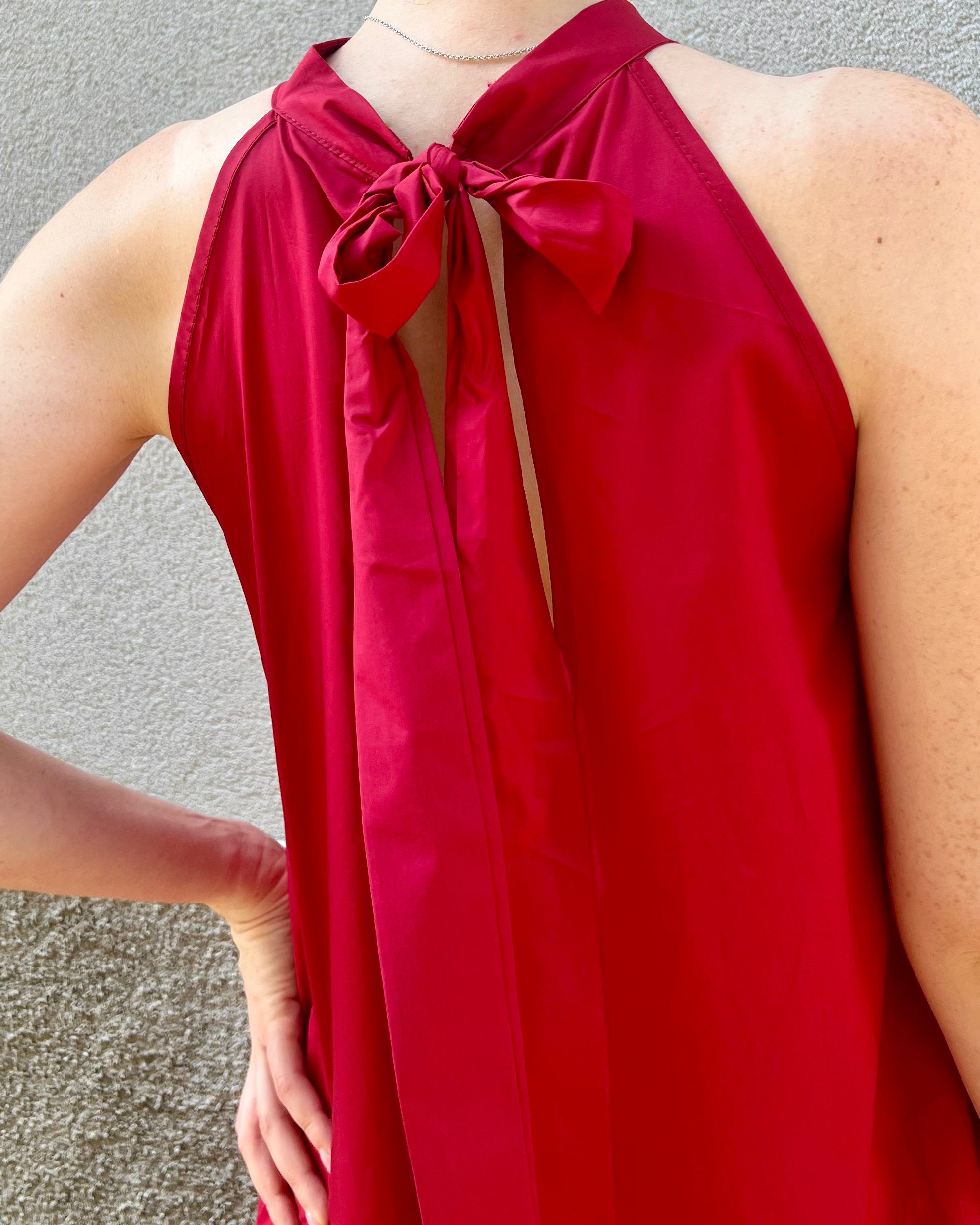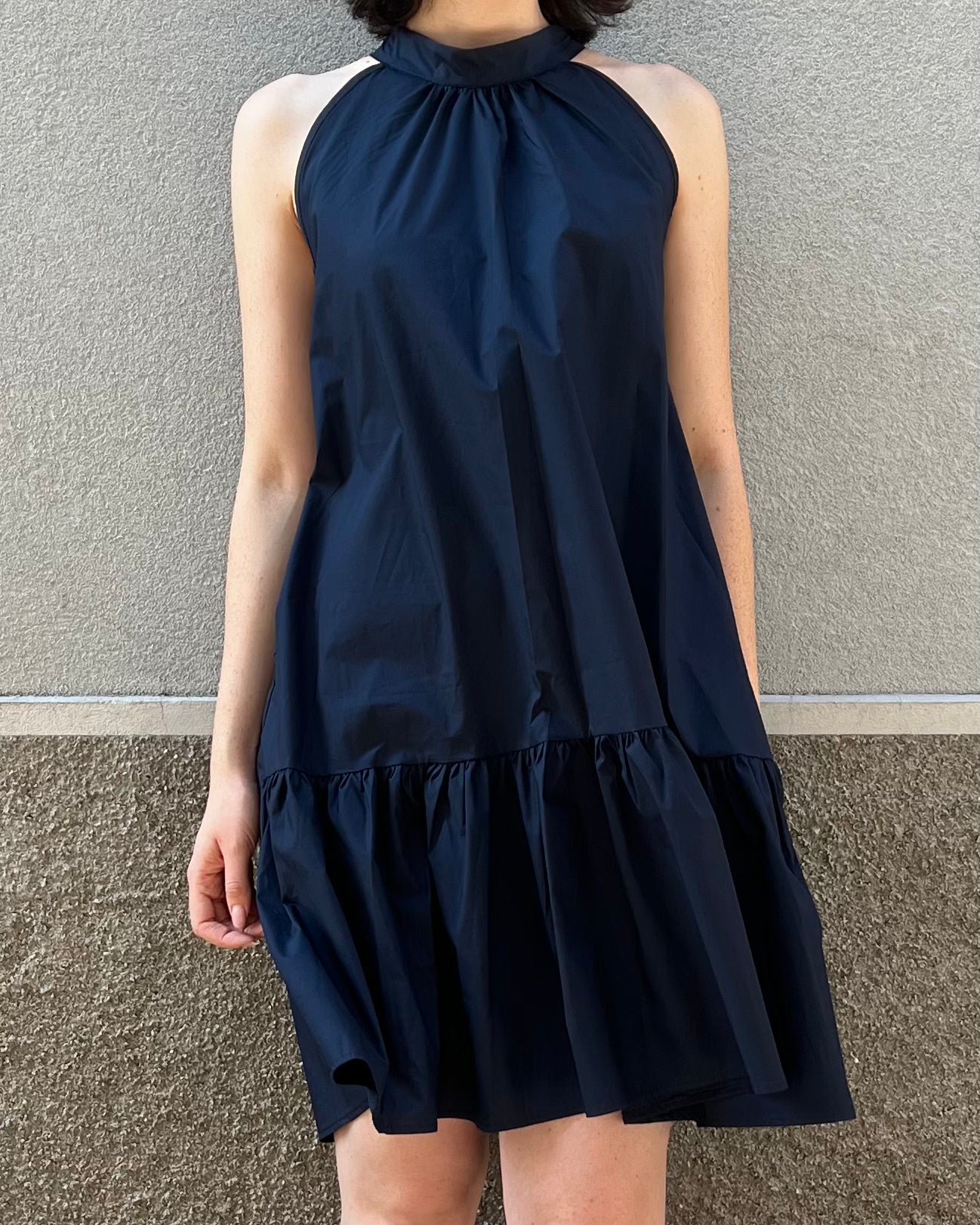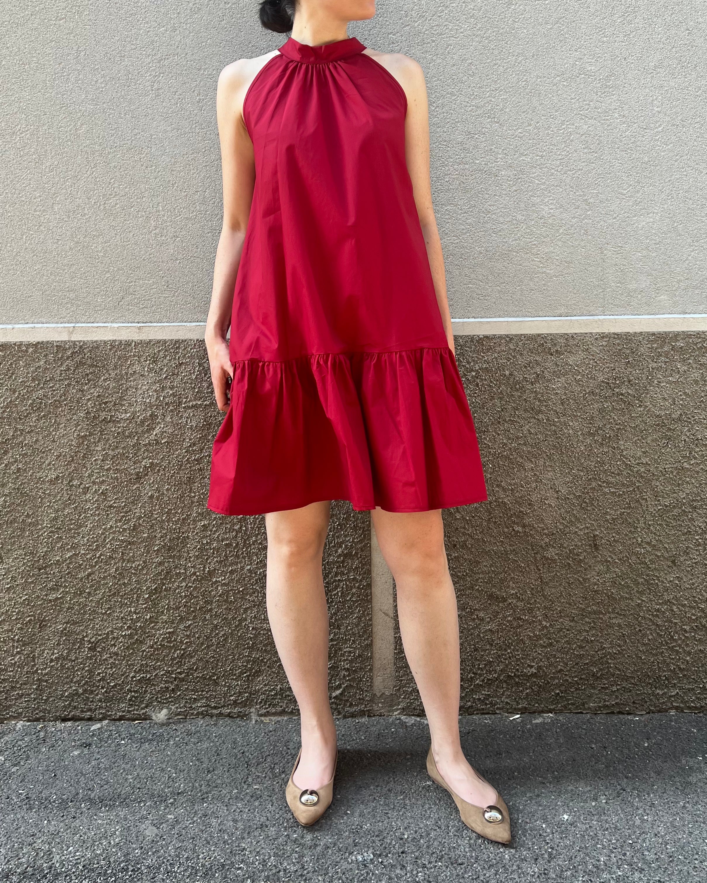 Abito svasato ampio con scollo halter e fusciacca sul retro. Scollo profondo su schiena.