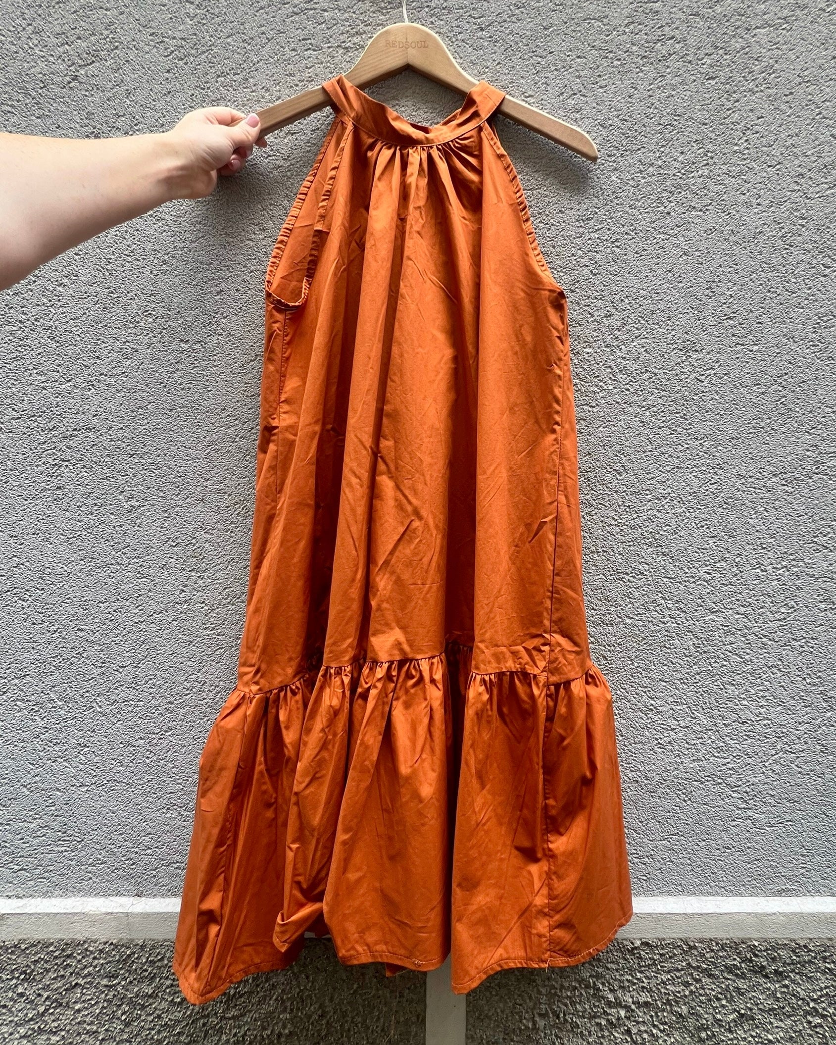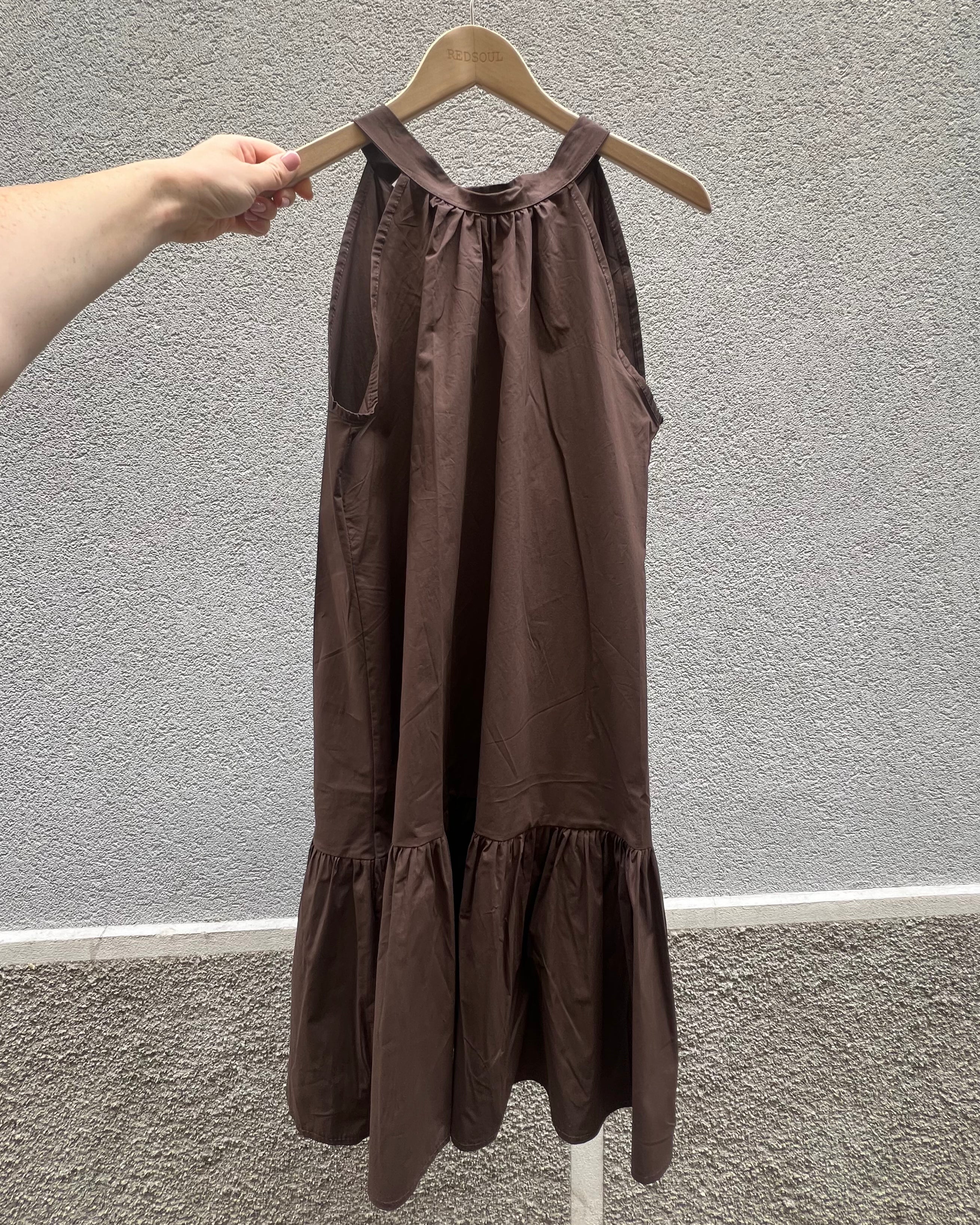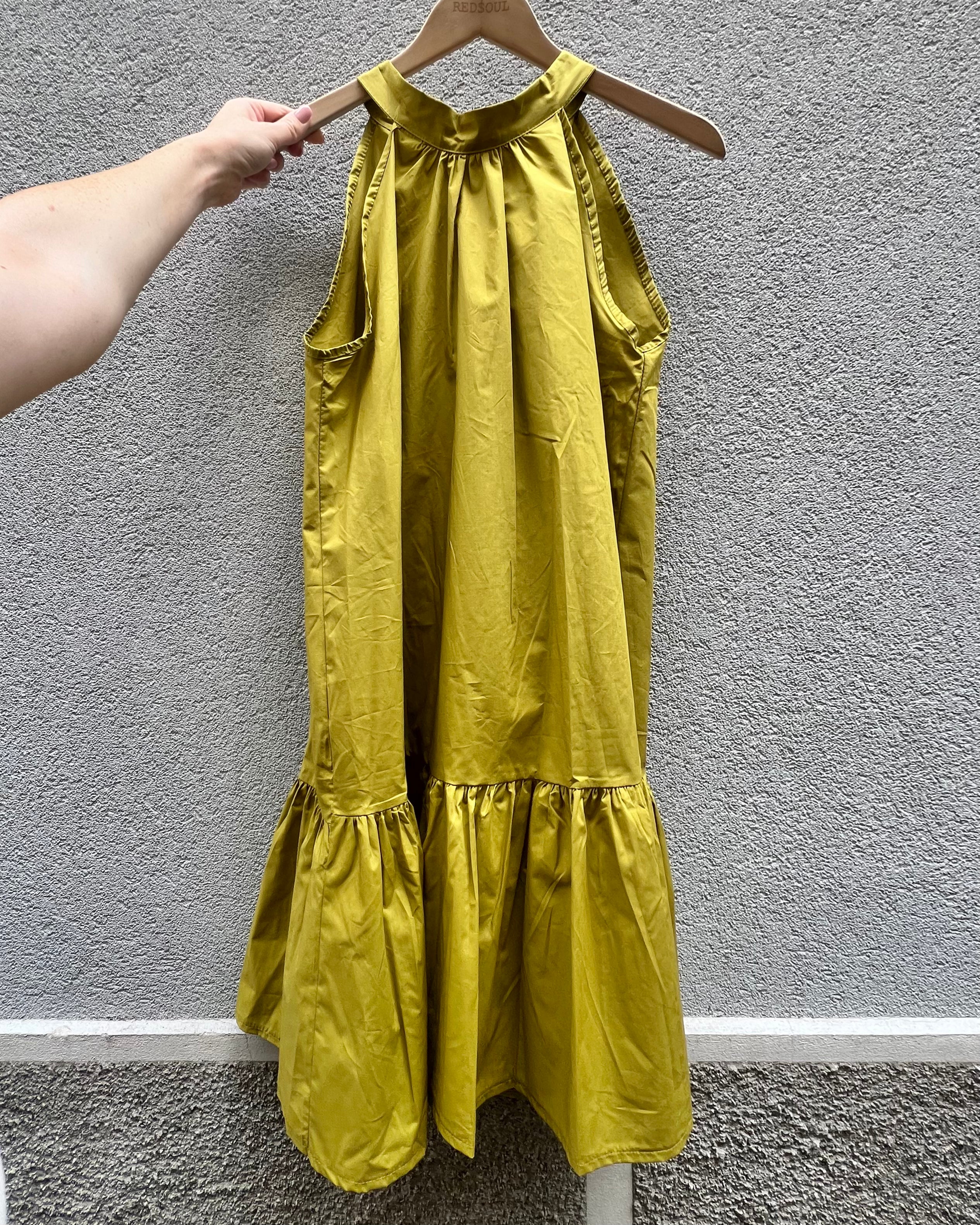 Abito svasato ampio con scollo halter e fusciacca sul retro. Scollo profondo su schiena.