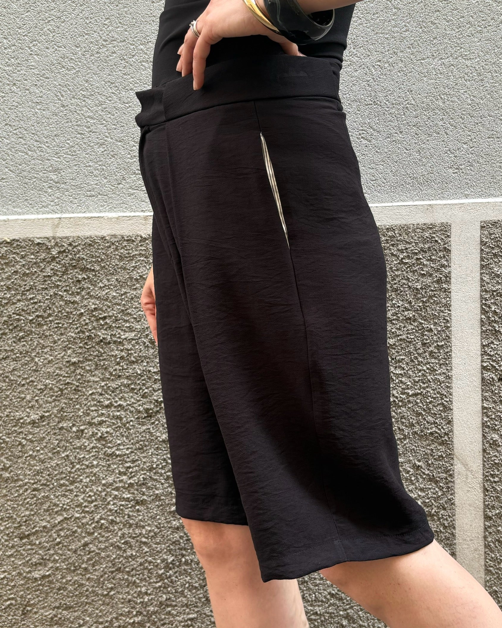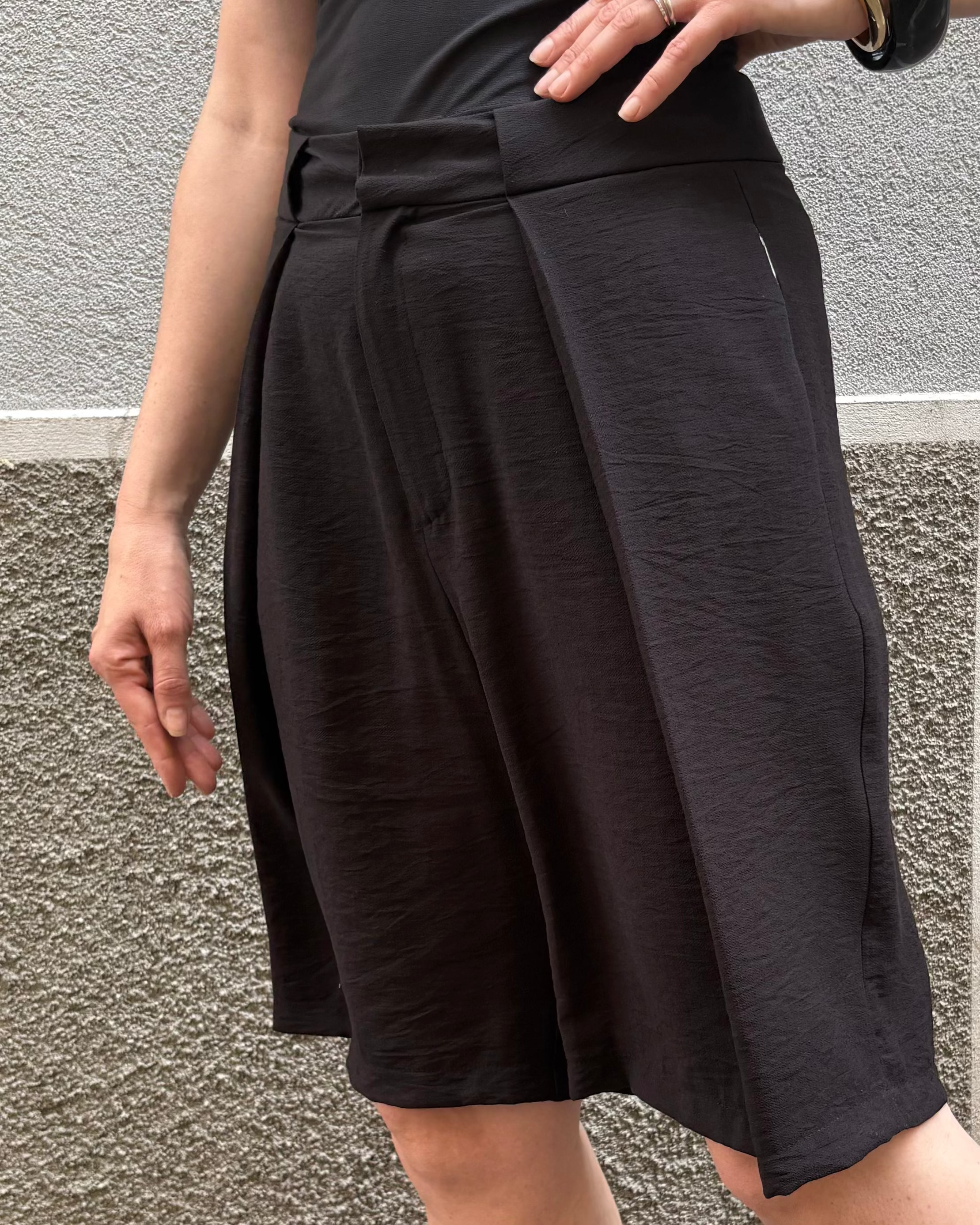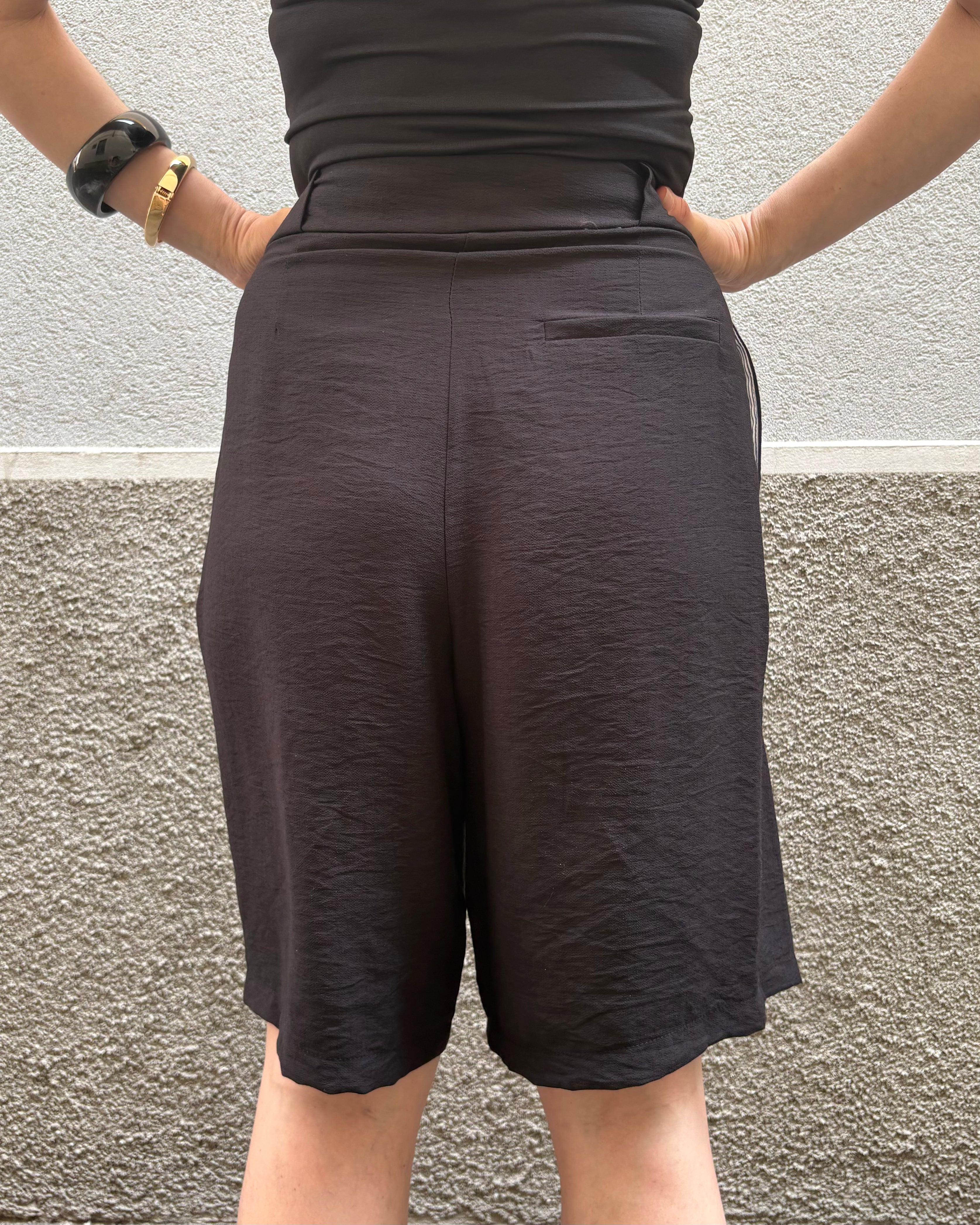 Bermuda realizzati in viscosa, caratterizzati da pince frontali e una gamba dal taglio ampio. Offrono una vestibilità classica e confortevole.