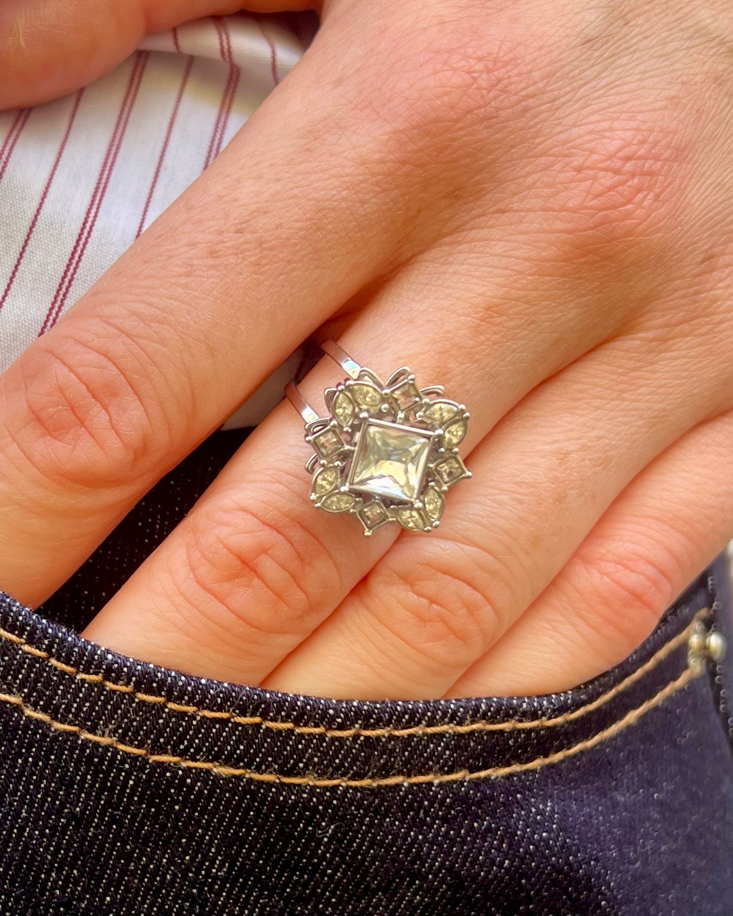 Anello dalla forma floreale girevole con pavè di strass.Disponbile in due varianti: acciaio oro & argento.